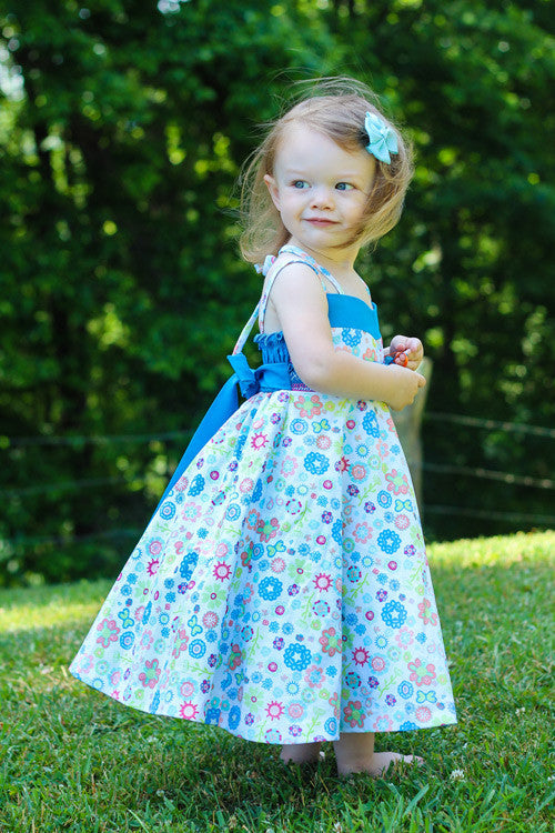 Sabina is our beautiful girls twirly blue floral spring and summer dress. The top has a blue band and two sets of straps, one set is for the shoulders and the second to tie in the back. The beautiful fabric has printed flowers, butterflies and paisleys in beautiful pink, turquoise, blue, yellow and green, this dress is a truly symphony of colors. The skirt is completely round for those big twirls, and it has a petticoat underneath for fullness, your little baby girl is definitely going to love this amazing floral dress. Available in infant, toddler and big girls sizes so you can match her little/big sister also a coordinated pink dress, mix and match time! Fully lined. Runs true to size.