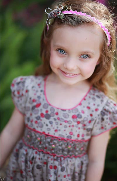 Our new 'Chocolate and Cherry girls dress' is the most precious dress! The material is a light brown with pinstripes and random, sporadic circles with cherry and darker brown colors. The short sleeves and the neckline are piped with a hot pink color. The hand smocking along the bodice ties the colors well with hot pink flowers and light green smocking. Hot pink scallops accent the hemline of the dress. This dress is fully lined and comes with a matching headband. This dress will look perfect for your little one!