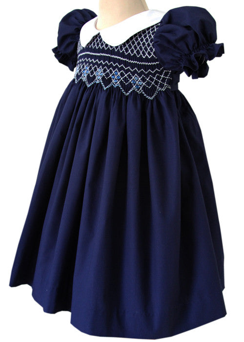 We have a pretty classic look here; our beautiful Bliss girl's dress features a white Peter Pan collar with crisp, clean lines that make it an instant favorite. The hand smocked is completely done in white color through the chest, puffy elastic short sleeves, the dress has buttons on the back, and a long sash for a must-have bow. Every mother's choice is for special events when the little pretties must be dressed to perfection!!
