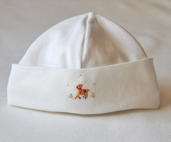 Hand embroidered with Rudolph the Red-Nosed Reindeer, this white beanie is perfect for your baby’s first Christmas. It will keep your little one warm on those cold winter nights.