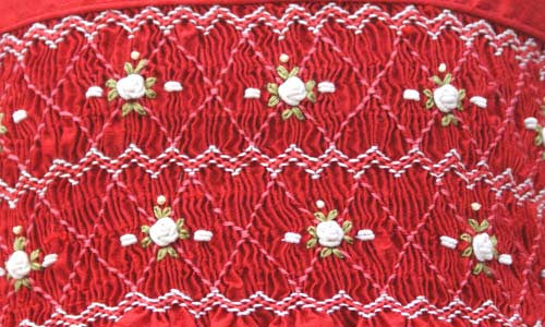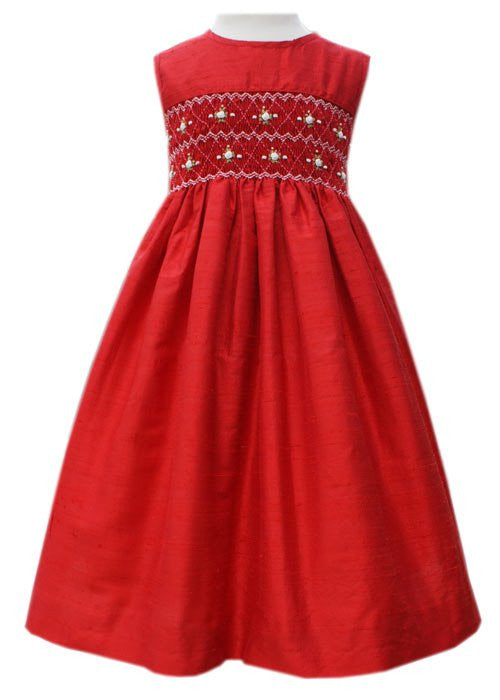 Our new Red Flower Princess Silk Girls Dress is definitely worthy of royalty! Made with a rich, red, silk material this dress is adorable. There is a panel of smocking on the chest. The design of the smocking is ivory roses with delicate green leaves. Sleeveless, this dress is perfect for any formal occasion. Adding to the formality there are four covered buttons in the back for an easy on and off and a long sash in the back to make the perfect bow for you perfect little lady!